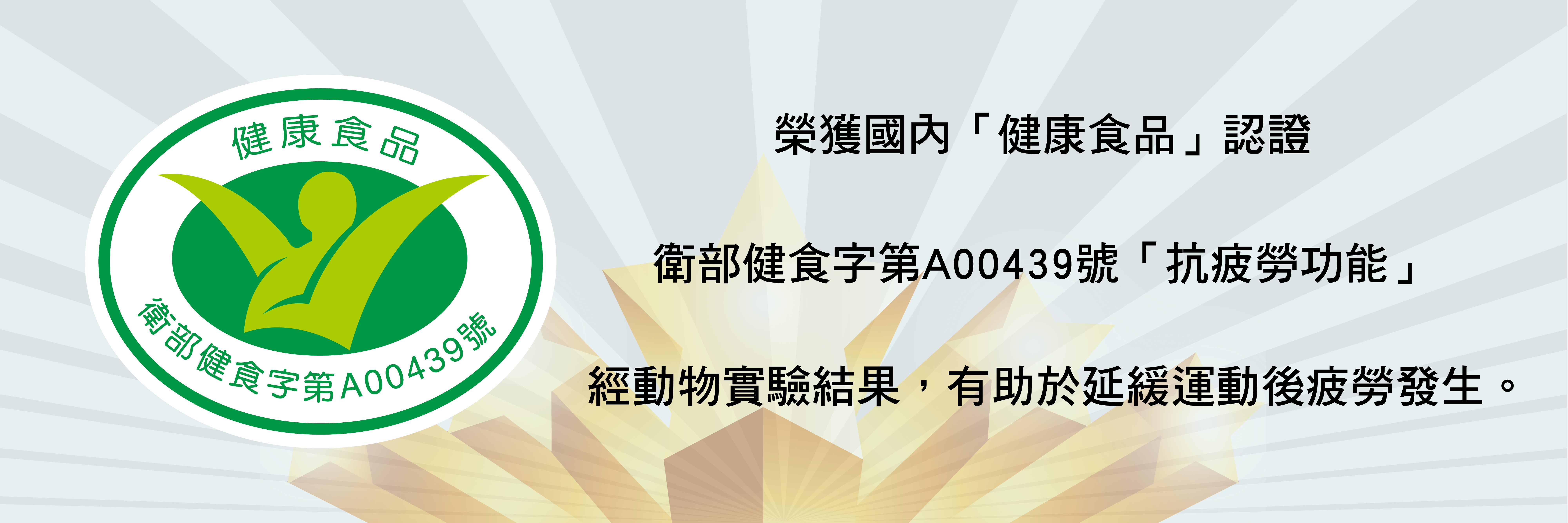 ※國家健康食品認證-衛部健食字第A00439號「抗疲勞功能」