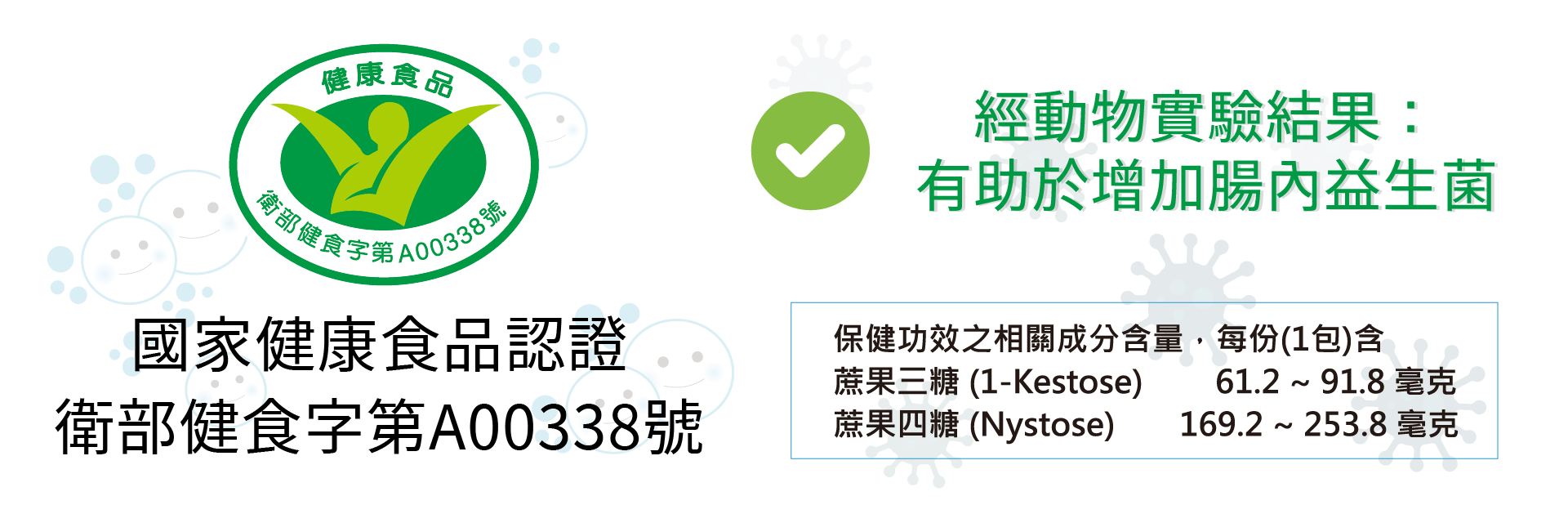 ▶保健功效成分:蔗果三糖 61.2 ~ 91.8 毫克/包、蔗果四糖 169.2 ~ 253.8 毫克/包
